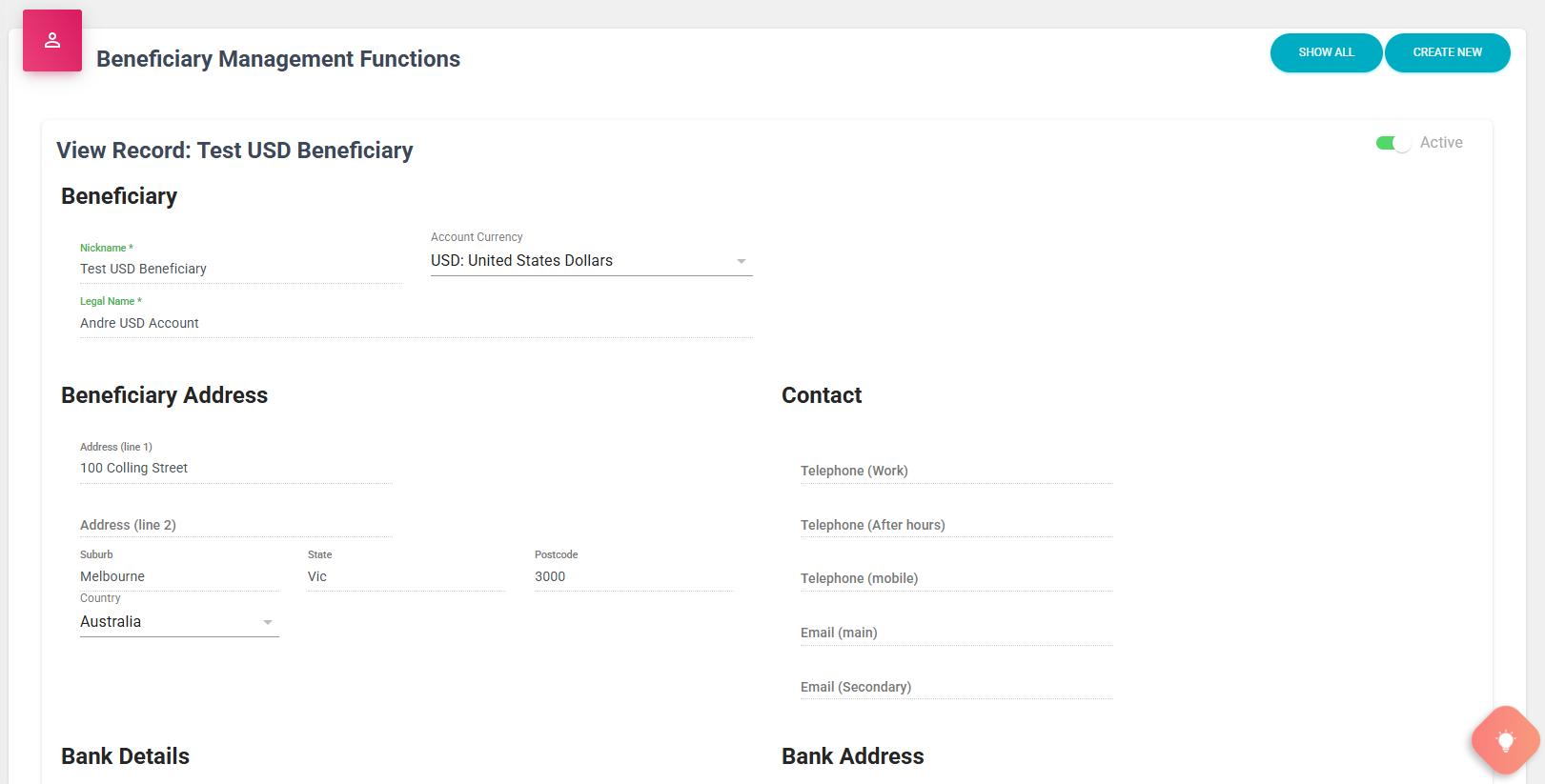 Within 'Upload Beneficiaries' there is the option to upload beneficiary documents To create a new beneficiary you can either upload documents or manually enter the details outlined here