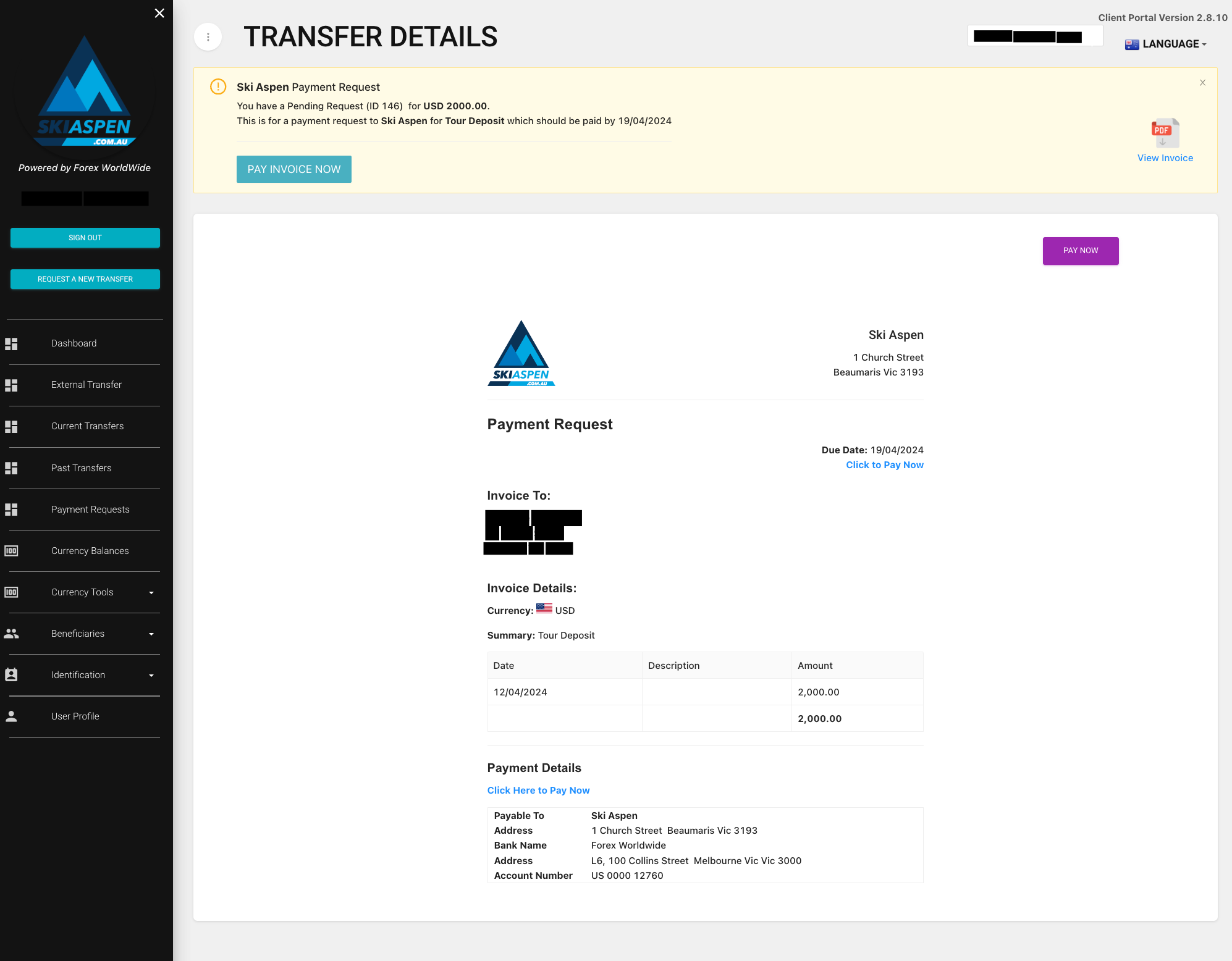 - Clicking on the button "Pay Invoice Now" will create a transfer request